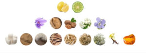 اسانس پایه کهربا، وانیل ، خزه درخت بلوط ، خس خس ، چوب صندل سفید ، چرم ، چوب کشمیر ، جیر ، قند
